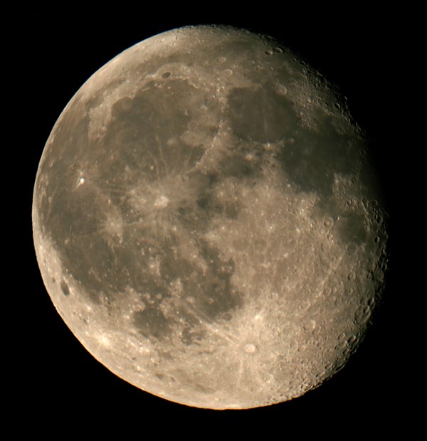 Der Mond ist noch recht rund, aber doch schon mit deutlichem Terminator. Er ist jetzt, trotz beeinträchtigtem Seeings in der geringen Höhe, unser Beobachtungsobjekt.