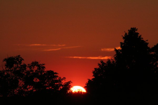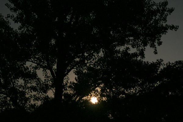 Die untergehende Sonne scheint zwischen den Bäumen durch, rasch ein Foto von einem wirklich malerischen Sonnenuntergang.