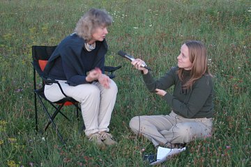 Ein kleiner Teleskopwald entsteht hier, trotz des Wochentags wollen einige den schönen Abend ausnützen. Wir haben Besuch. Nora Kirschlager von Ö1 macht eine Reportage über Amateurastronomie und interviewt Anneliese Haika.