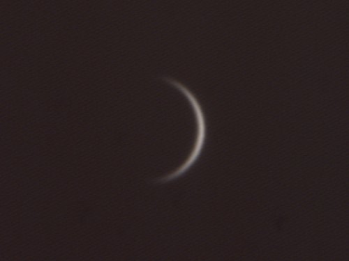 Dichtere Wolken haben den Nachmittag bestimmt, lösen sich am Abend aber auf. In einem großen Wolkenloch gelingt mir zunächst einmal ein Blick zur Venus. Erstaunlich, wie groß und dünn die Sichel geworden ist.