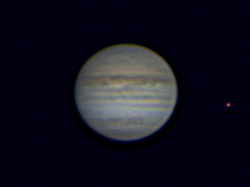 Beeindruckend ist, wie gut die rötliche Färbung von Io herauskommt. Jupiter zeigt sich mit dünnem, dunklen NEB und nach wie vor ohne besonders ausgeprägtem SEB. An die 10 mehr oder weniger durchgehende Bänder sind zu sehen, teils unterbrochen durch zahlreiche helle und dunkle Flecken. Noch immer ist die Südhalbkugel deutlich weißer als die Nordhalbkugel. Interessant.