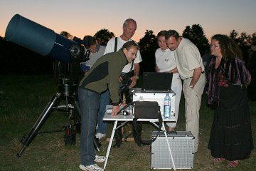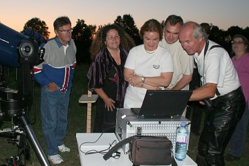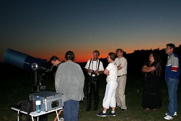 Unsere Gäste werden zahlreicher, und unter den später Hinzugekommenen findet sich auch eine junge Dame, die perfekt als Französischdolmetscherin fungiert. Das macht den Sternabend für unsere Gäste aus Frankreich jetzt zum Erlebnis. Eine Familie holt sogar ihre Kinder aus dem Hotel, damit sie mitmachen können. Unter den neu hinzugekommenen Gästen ist auch ein junger Mann aus Neuseeland. Mit ihm können wir uns auf Englisch unterhalten. Er hat im Februar den Kometen McNaught gesehen und schwärmt noch immer davon, dass er sich über ein Viertel des Himmels erstreckt hat. Neid! Es wird rasch dunkel und wir tauchen in die Welt der Deep Sky Objekte ein. Matthias mit seinem 12" Dobson und Roland mit seinem 18" Dobson treffen auch ein, so dass wir jetzt auch genug Fernrohre haben. Zuerst ein paar Doppelsterne. Albireo begeistert durch seine Farben, epsilon Lyrae durch die witzige Anordnung der beiden Paare. Und dann kommen die Kugelsternhaufen. Beim Anblick von M13 ist so mancher Freundenschrei weit zu hören! Wir zeigen auch M2, M15 und M92. Dann kann die komplette Sternentwicklung gezeigt werden, von M17 und M16 (dank UHC-Filter) bis zu M57 und sogar zum Cirrus-Nebel (auch wieder mit UHC-Filter). Unsere Gäste verlassen uns, ein wenig zu früh, denn jetzt geht der Mond im Letzten Viertel auf. Eine interessante Phase!