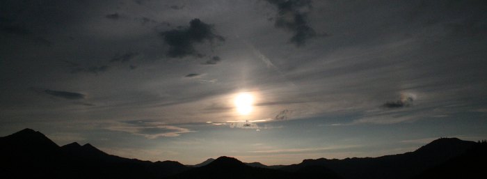 | Bericht: | Die Wolken am Nachmittag haben uns beim Computerworkshop nicht gestört. Jetzt, am Abend, offenbar auch nicht. Erstens vertrauen wir dem Wetterbericht, der deren Verschwinden vorhersagt, und zweitens ist die Stimmung so gut, dass einfach alle ihre Instrumente aufbauen. Ich denke, sie hätten sie auch bei gänzlich bedecktem Himmel aufgebaut. Oder? Die abziehenden Cirren bescheren und zwei schöne Nebensonnen.