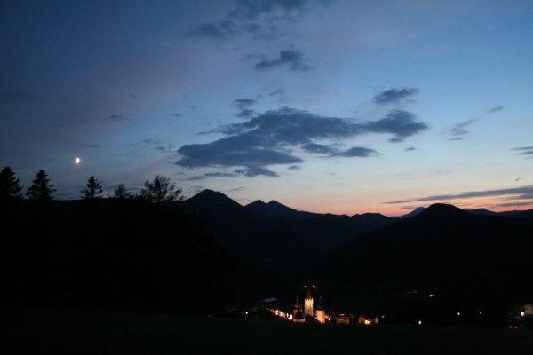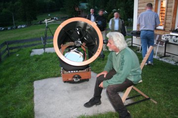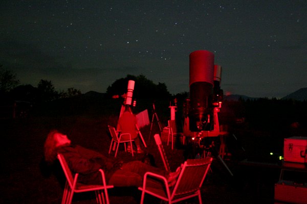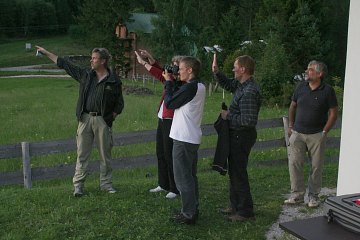 Bis Mitternacht beobachten wir ausschließlich visuell und bestaunen zunächst die Kugelsternhaufen M3, M13, M92, M56, M2 und M15 in diversen Teleskopen. Auch der unscheinbare M72 kommt dazu. Dann geht es, schon mit einem UHC Filter bewaffnet, an die planetarischen Nebel M27 und M57. Ein besonderer Höhepunkt ist der Nordamerikanebel. Er ist mit freiem Auge zu sehen, vor allem, wenn man den UHC-Filter vor das Auge hält. Mit Filter am Fernrohr beobachten wir dann die tief stehenden M8, M16 und M17 sowie die hoch stehenden Cirrus- und Crescent-Nebel. Es ist heute dunstiger als gestern und daher stört das Licht der Basilika-Beleuchtung heute wirklich extrem. So wenden wir uns dem Himmelsbereich von Norden nach Osten zu. Da steht die Galaxie NGC 4036 mit der hellen Supernova 2007gi. Sie ist sehr deutlich, aber ist sie nicht schon etwas schwächer geworden? Die beste Sicht haben wir im Bereich von Perseus, Cassiopeia und Andromeda. Dort stehen viele interessante Objekte, allen voran M31, sowie zahlreiche Sternhaufen.