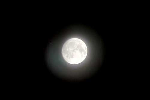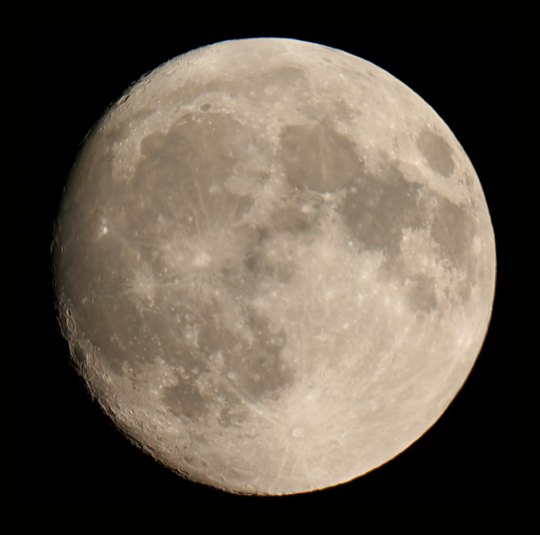 Der Mond ist trotz seiner noch recht geringen Höhe sehr hell und ohne Monfilter ist an eine Beobachtung nicht zu denken. Man erkennt noch einen recht interessanten Terminator, rund eineinhalb Tage vor Vollmond.