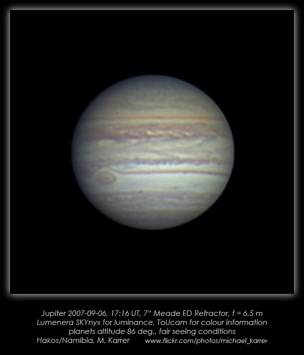 | Bericht: | Mit Ende der Abenddämmerung und Jupiter im Zenit begann der Große Rote Fleck sichtbar zu werden. Die Luftruhe war nicht ganz so gut wie am Vortag, aber immer noch ein Traum gegenüber heimischen Verhältnissen,