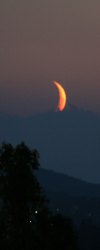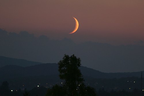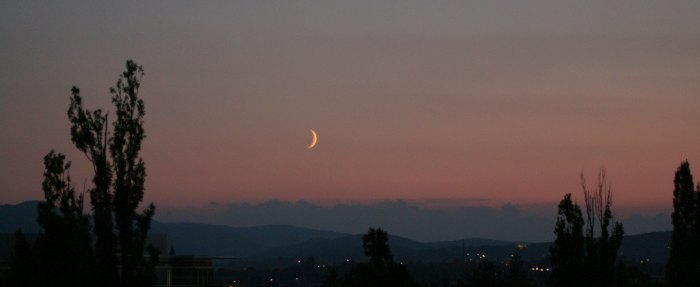 Herbst, das ist die Zeit, in der die zunehmenden Mondphasen tief am Westhorizont stehen. Die Ekliptik liegt flach zum Horizont, da sie vom Herbstpunkt, nahe dem dem Sonne jetzt steht, um den Winkel der Ekliptikschiefe von 23,5° fällt. Heuer kommt noch hinzu, dass sich der absteigende Knoten der Mondbahn auch in der Nähe des Herbstpunkts befindet und die Mondbahn mit ihrer Neigung von etwa 5,2° auch noch gegenüber der Ekliptik nach süden fällt. Da die Tagesbahnen der Gestirne im Westen zum Horizont 42° nach Süden geneigt sind, liegt die Mondbahn jetzt nur rund 13° zum Horizont geneigt. Der zunehmende Mond ist also kurz nach Sonnenuntergang tief im Südwesten zu erwarten. Da ist er auch, und aus einer nüchternen mathematischen Überlegung wird ein Naturschauspiel von außerordentlicher Schönheit.