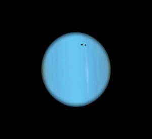 Ich überlasse es unseren Leserinnen und Lesern, ob da blickweise eine leichte Abdunkelung auf der Scheibe des Uranus zu sehen ist, verwaschen und undeutlich, wie aufgrund der Subpixel-Interpolation wohl nicht anders zu erwarten ist. Es kann sich auch um ein Rauschartefakt handeln. Oder doch nicht. Bitte nachmachen! Nur mehrere solche Beobachtungen können zeigen, ob es möglich ist, Schattenvorübergänge auf Uranus zu beobachten. Das geht jedenfalls nur heuer, in einer der seltenen Kantenstellungen des Uranus (alle 42 Jahre). Die Monde stehen jedenfalls heuer schön in einer Linie.