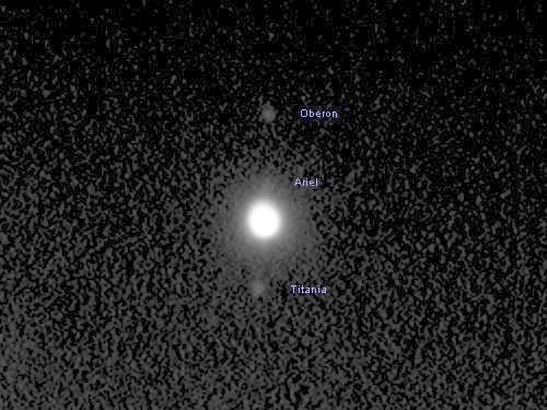 Noch zwei Planeten mit Monden stehen heute auf meinem Programm, Uranus und Neptun. Um deren Monde ins Bild zu fassen, bediene ich mich meiner alten StarlightXpress MX 916. Sie ist nach wie vor die empfindlichste Kamera in meiner Ausrüstung, auch wenn sie nur briefmarkenformatige Bilder liefert. Erstes Ziel ist Uranus, und bald erkenne ich auf den verrauschten, weil kurz belichteten Aufnahmen drei Monde. Starry Night zeigt, dass es sich um Ariel, Titania und Oberon handelt. Wo ist Umbriel? Starry Night zeigt das Unglaubliche: