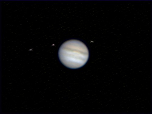 Als nächstes zu Jupiter, der tief im Südwesten in der Dämmerung steht. Heute passt das Seeing so einigermaßen, so dass sogar ein Webcambild möglich ist. Gleich drei Galileische Monde stehen heute ganz nahe beim Planeten.