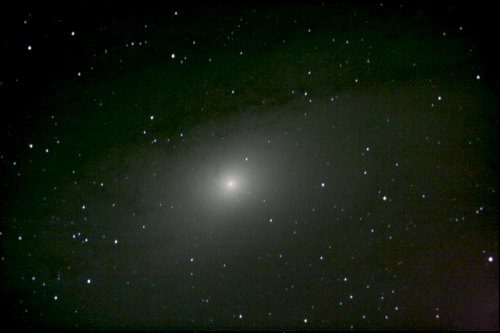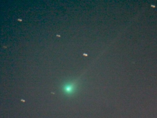Obwohl es noch gar nicht richtig dunkel ist, zeigt der Komet einen deutlichen, dünnen Schweif. Visuell können wir über einen Zeitraum von einer halben Stunde seine Bewegung ganz leicht erkennen. Ein netter Komet.