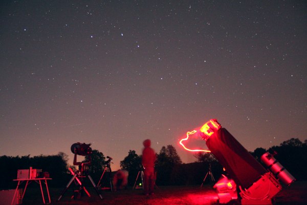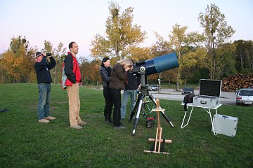 Heute sind doch einige Beobachter hierher gekommen, denn der klare Abend sollte gute Bedingungen bieten, den schwierigen Kometen C/2007 F1 (LONEOS) zu sehen. Doch zunächst stehen hellere Objekte auf dem Programm. Das beginnt mit dem Neulicht des Mondes, das im Herbst wegen der flachen Ekliptik gar nicht so leicht zu beobachten ist.