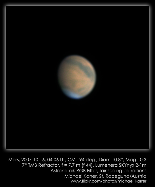 | Bericht: | Die hohe Kulmination von 65 Grad macht das winzige Marsscheibchen attraktiv. Die Luftruhe war nicht so exzellent wie es bei einem großen Hochdruckgebiet möglich wäre.