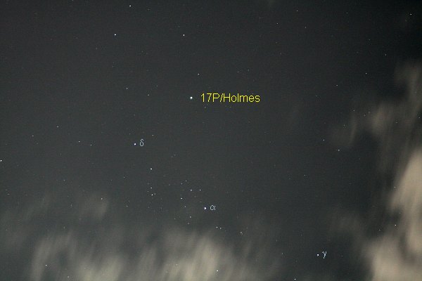 Der schon etwas über den Vollmond hinaus gewanderte Mond beleuchtet die Szene hell, doch das macht nichts. Er ist ein tolles Werkzeug, um meine Kamera zu fokussieren. Jetzt heisst es warten. Das Wolkenloch nähert sich dem Perseus, es tauchen zwei helle Sterne auf. Zwei? Einer muss Algenib sein. Wohl der hellere. Aber der helle steht östlich. Es ist 17P/Holmes! Der Komet ist heller als der 1,9mag helle Hauptstern des Perseus, Algenib oder Mirfak. Rasch ein Foto.