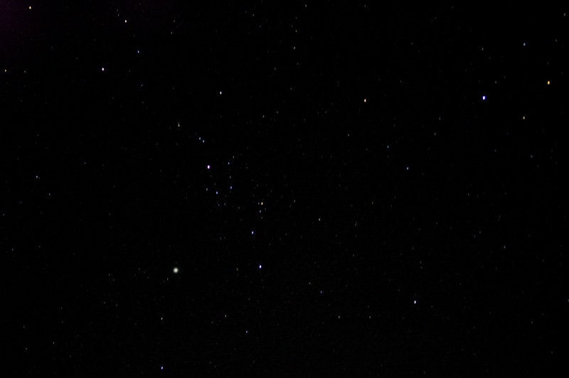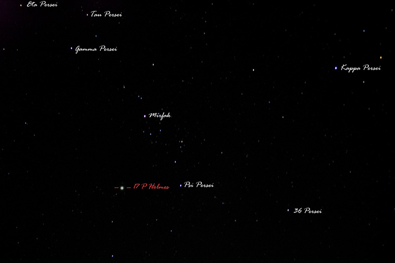 Bericht: | Da mir mein Teleskop momentan nicht zur Verfügung steht, kann ich zuhause "nur" mit dem Feldstecher gucken. Also habe ich meine Nikon D70 mit einer 70-200mm Zoomoptik auf den Perseus ausgerichtet und mit 1600 ASA 30 Sekunden lang belichtet. In diesem Fall natürlich ohne jegliche Nachführung; was die absolute Grenze der Verträglichkeit punkto Sternenabbildung für diese Brennweite darstellt. Nun ja, Stricherl sind sie sehr wohl geworden, die Sterne. Doch P17/Holmes ist schön drauf! Das auf 800 Pixel Seitenlänge verkleinerte Originalbild zeigt die Sterne noch halbwegs als "Punkte", so dass man sich nicht all zu sehr genieren muss. In der Vergrößerung würde es jedoch grauslich werden.