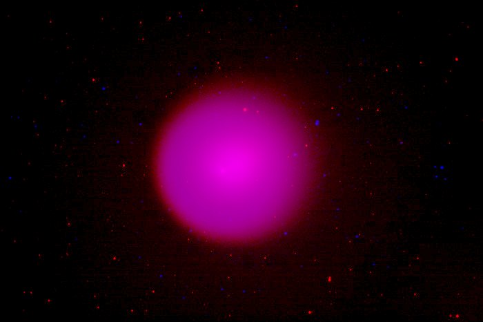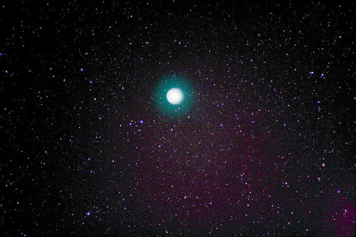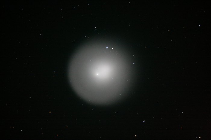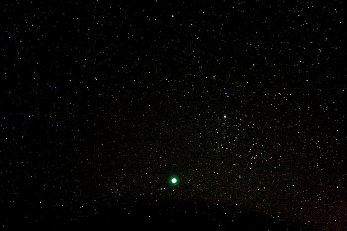 Dann ans Fernrohr. Ich beginne gleich mit dem Okulartest. Doch mit einem 8,8mm Meade UWA-Okular (82°) füllt der Komet mein Gesichtsfeld aus. Ich wechsle auf ein 40mm SWA (68°), das ist ein toller Anblick. Fotografisch sieht das ganze dann so aus: