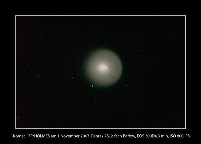 | Bericht: | Nachdem ich den Kometen 17P/Holmes schon am Montag den 29.10 mit dem 10" Dobson durch ein "30min-Wolkenloch" beobachtet hatte, habe ich ihn am Allerheiligenabend bei besten astronomischen Bedingungen (kein Nebel) fotografiert. Ein sensationelles aber auch merkwürdiges Objekt!