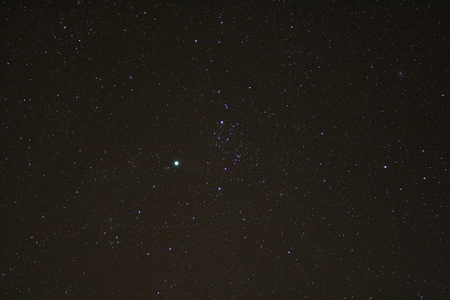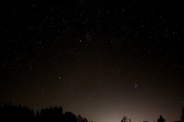 die Plejaden über dem NO-Horizont am oberen Rand des Lichtdoms von Wien - noch aus einer Entfernung von 50km Luftlinie von hier aus deutlich zu sehen! Zoom-Objektiv bei F=18mm