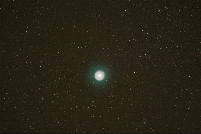 Grüner Halo um den Kometenkopf. Spiegeltele F=300mm, 2x5 und 2x60 Sekunden