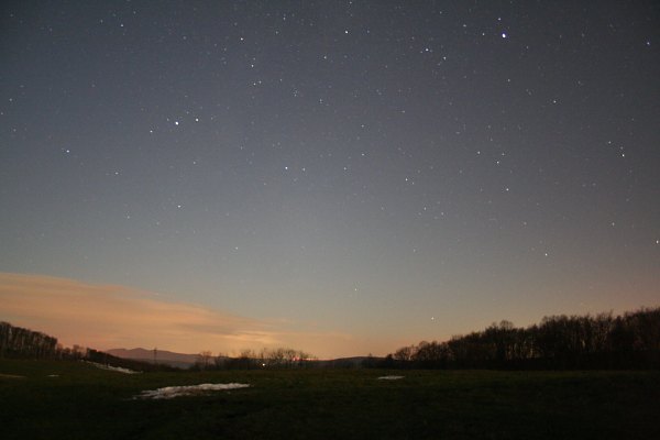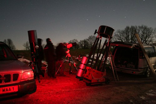 Visuell im Okular erinnert Mars an einen rötlich gefärbten Vollmond, fotografisch erinnert das Bild an die ersten Fotos der Mondrückseite von Luna 9 aus dem Jahr 1959, nur in Farbe. Es ist die interessanteste Seite des Mars, und leider merkt man, dass bei nur 15" scheinbarem Durchmesser doch der letzte Kick fehlt, verglichen mit den 25" von 2003. Erstaunlich ist noch immer die ausgedehnte Polhaube im Norden. Der Himmel ist jetzt ordentlich hell, es gibt nichts mehr zum Beobachten. Erfreulich früh bauen wir ab. Der einzige Vorteil der Winternächte. |