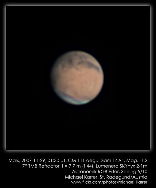 Lange, sehr lange, hat es gedauert, bis mir wieder einmal ein Blick zum Mars bei halbwegs akzeptabler Luftruhe gegönnt war. Visuell ist einiges an Begeisterung nötig, um dem kleinen Scheibchen was abzugewinnen. Noch dazu bei feuchten Minusgraden. Die Webcam bringt zumindest Details hervor. Ich frage mich, welch super Seeing manche Astrokollegen haben müssen angesichts ihrer hervorragenden Aufnahmen. Bleibt abzuwarten, ob sich ein stabiles Hoch mit ruhiger Luft auch über meinen Beobachtungsplatz einmal niederläßt ...