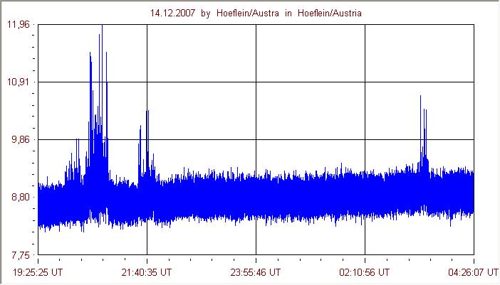 | Bericht: | Wolken. Hochnebel. Manchmal frage ich mich wozu ich überhaupt ein Fernrohr habe. Gott sei dank gibt es auch noch andere Möglichkeiten sich astronomisch zu versuchen. Nach Einschulungen durch Fritz Lensch in verschiedene einfachste Bereiche der Radioastronomie für Anfänger, wollte ich endlich eine radioastronomische Meteor Aufnahme durchführen. Die Geminiden bieten sich dafür an, weil sie als ein relativ starker Strom auftreten, nach dazu verlässlich sind. Der technische Versuchsaufbau ist auch nicht kompliziert. Es genügt ein gutes Radio, eine Aussenantenne, ein PC mit Soundkarte und Radiosky-Software. Der Nachweis erfolgt über Radiowellen eines entfernten Radiosenders, die von der ionisierten Spur eines verglühenden Meteors reflektiert werden, wodurch man ganz kurz die Aussendung empfangen kann. Im Normalfall hört man nur das Rauschen eines nicht abgestimmten Radios, und gelegentlich 1/4 bis 1/2 Sekunde Musik- oder Sprachfragmente. Das empfangene Signal wird am Computer aufgezeichnet und auf einem Stripchart wiedergegeben. Zu sehen gibt es dann einen Empfangspegel im Zeitverlauf. Wenn gerade ein Meteor verglüht, also Sprache erkennbar ist, führt das zu einer erhöhten Amplitude, die entsprechend am Stripchart aufgezeichnet wird. Im folgenden Stripchart sieht man ganz nett eine gemessene Aktivität um etwa 20:30 UTC und noch einmal eine geringere Aktivität in der Früh nach 3 Uhr UTC.