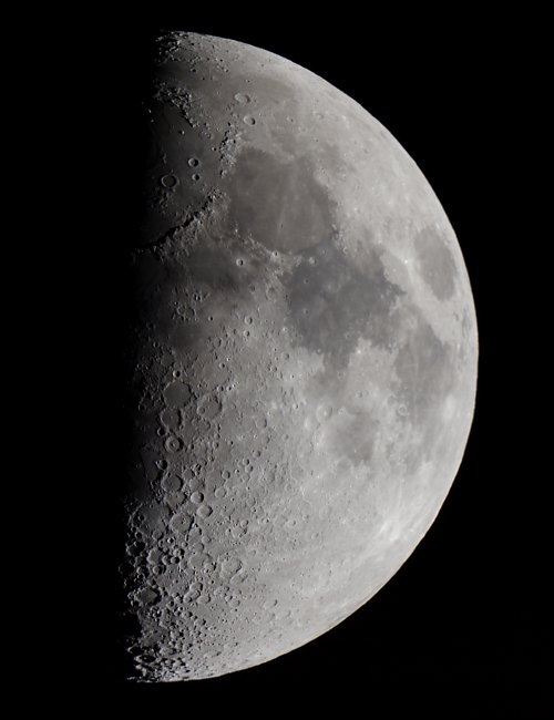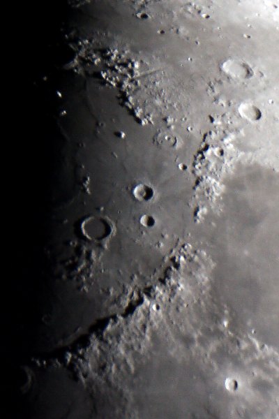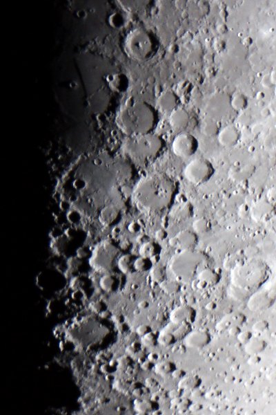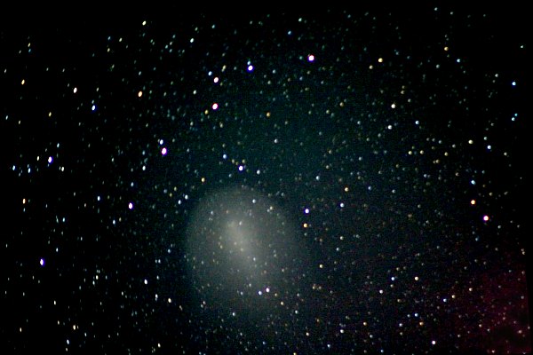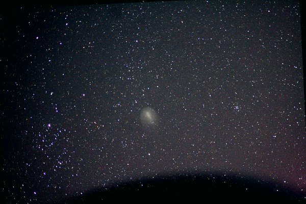 Schon am Mond ist das Seeing so gut, dass selbst einzlene Schnappschüsse mit der am Fernrohr montierten Canon EOS 350D bei 3m Brennweite gestochen scharf werden. Der Mond ist auch ein sehr schönes Beobachtungsobjekt, doch leider hellt er den Himmel auch extrem auf. Ob das den Kometen 17P/Holmes stören wird? Etwas, aber nicht sehr. Der Komet steht im Zenit und ist trotz Mondlicht gut mit freiem Auge zu sehen, als diffuser Fleck. Im Feldstecher ist er ebenfalls sehr diffus und lange nicht mehr so kontrastreich wie im November. Ich nehme ihn mit der huckepack montieren Kamera auf. Da der Komet praktisch genau im Zenit steht, handle ich mir mit meiner azimutalen Aufstellung schon bei nur 15s Belichtungszeit eine grausliche Bildfeldrotation ein.