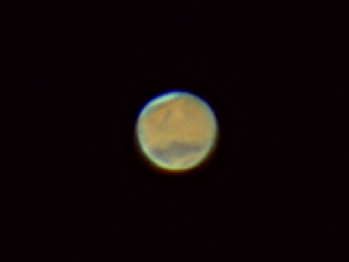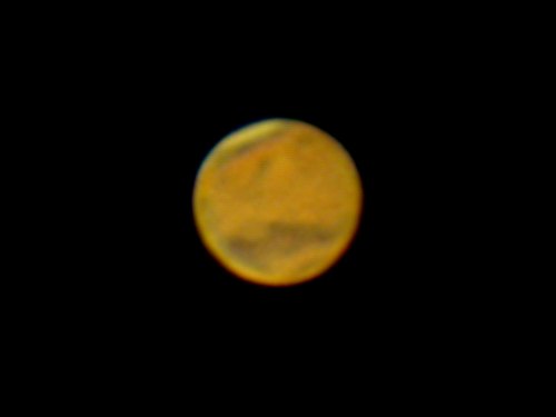 Ich suche auch den Kometen 8P/Tuttle auf, doch der erweist sich als herbe Enttäuschung, nur mit viel Mühe kann ich ihn visuell ausmachen. 7mag können das wohl kaum sein. Doch jetzt zum Mars. Der Rote Planet steht schon sehr hoch und schon visuell, bei mehr als 400-facher Vergrößerung, ist der Anblick beeindruckend. Schade, es ist eine eher langweilige Seite des Planeten zu sehen, doch selbst auf dieser, größtenteils homogen rötlichen Fläche erkennen wir viele Details. Rasch ist die Webcam montiert. Bei dem guten Seeing kann ich mit sehr langer Brennweite aufnehmen.