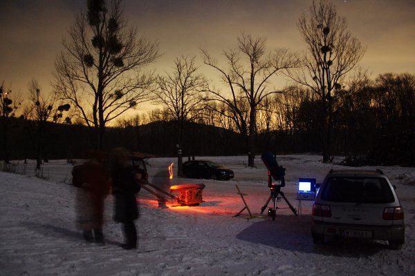 Beobachten im Winter, das ist eine Grenzerfahrung. In klaren Nächten kühlt es stark ab; erheblich mehr Motivation als im Sommer ist gefragt. Und die Enttäuschung, wenn das Wetter dann doch nicht mitspielt, ist auch viel größer als in der warmen Jahreszeit. Doch letztlich klappt es heute. Roland und ich beobachten, begleitet von einem sehr kleinen Grüppchen treuer Stammgäste.