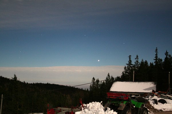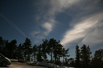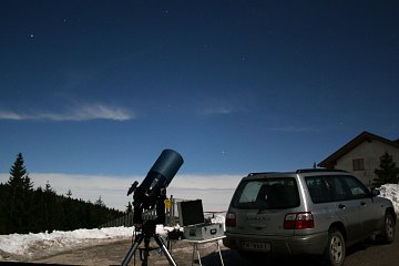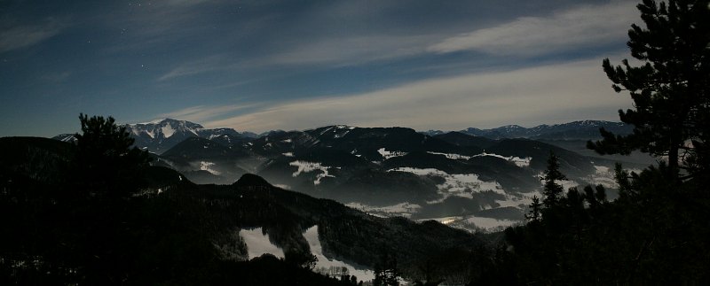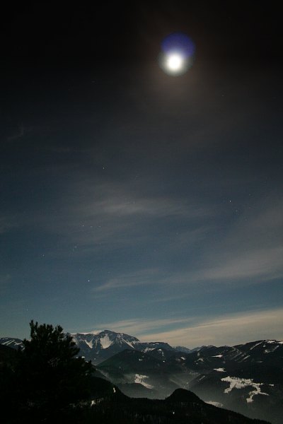 | Bericht: | Ich stelle den Wecker auf 3 Uhr und gehe früh zu Bett. So weit so gut, nur finde ich keinen Schlaf. So beschliesse ich bereits um 1 Uhr morgens, auf die Kleine Kanzel zu fahren. Die Ausrüstung ist vorbereitet und rasch bei ungastlichen -5°C ins Auto verstaut und ich mache mich auf den Weg. Erstaunlich, dass an diesem Tag zu dieser Zeit noch andere Leute unterwegs sind. Vor Wiener Neustadt fällt mein Blick über die schneebedeckten Felder. Die Landschaft ist hell. Moment mal, wieso hell? Hier, zwischen Leobersdorf und eben Wiener Neustadt, ist keine größere Ortschaft. Was bitte hüllt das Land in so helles Licht? In der Tat, es ist der Vollmond. Hier ist also kein Hochnebel mehr. Nach Winzendorf erkenne ich auch die ganze Hohe Wand vor mir. Im Tal hat es bissige -8°C, unmöglich, die Heizung im Auto nicht einzuschalten. Die einsame Fahrt auf die Kleine Kanzel fürht durch eine malerische Landschaft, die anfangs vom Rauhreif, später vom Schnee gezeichnet wurde. Auf der Kleinen Kanzel hat es +1°C. Noch immer Inversion. Ich studiere die Lage und baue auf.