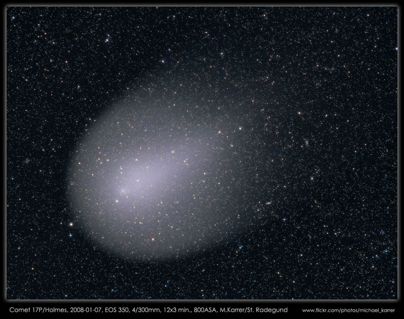 | Bericht: | Trotz abnemender Helligkeit ist der Komet immer noch ein interessantes Fotoobjekt. Die gute Durchsicht läßt es zu, dass ich Holmes schwach, aber deutlich mit freiem Auge erkennen kann. Freilaufende Aufnahmen zu je 3 Min. bei 800 ASA mit modifizierter Canon EOS 350. In der hier verkleinerten Darstellung sind die vielen Galaxien nur bedingst zu erkennen.