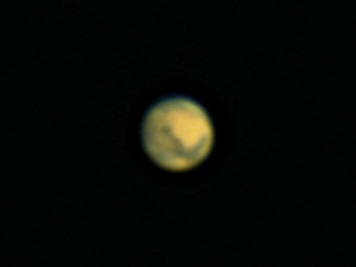 Etwas später Mars. Er ist nur mehr 13" klein und bei dem Seeing ist der Unterschied zu meiner letzten Beobachtung nicht zu übersehen.
