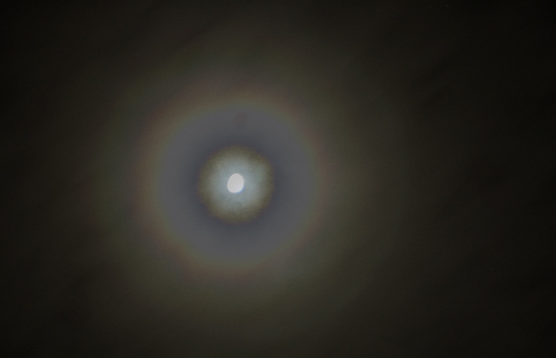 | Bericht: | entgegen aller Voraussagen ist der frühere Abend gestern überraschenderweise klar für astronomische Beobachtungen geworden. Um ca. 21:30 sind dann Cirrhen aufgezogen und das Beobachten per Teleskop hat keinen Sinn mehr gemacht. Doch plötzlich hat für die Dauer von 2 Minuten ein aussergewöhnlich interessanter Mondhalo aufgeleuchtet. Es hat gerade ausgereicht die Nikon starklar aufs Stativ zu kriegen. Nach 2 Minuten ist alles vorbei gewesen. Danach wurde es zu einem typisch weinviertlerischen trüben Abend, ohne weitere Sicht auf den Sternenhimmel. Das Foto ist ein Komposit aus 3 Einzelaufnahmen.