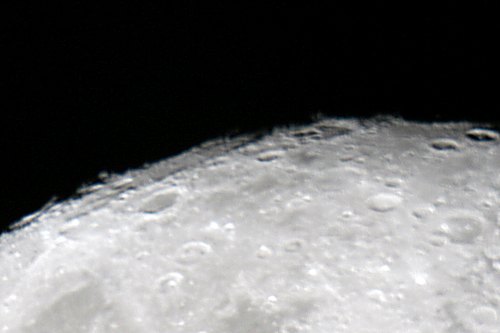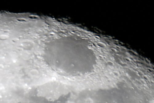 Es ist immer wieder erstaunlich, welch kleine Details mit dieser Technik sichtbar werden; es ist zwar die unspektakuläre Seite des Planeten, aber Syrtis Maior ist schon über den Rand und den bereits merklichen Terminator gekommen. Interessant auch die dunkle Struktur nahe dem Südpol. Auch interessant, dass heuter die nördliche Polhaube nicht verschwunden ist, anders als in den vergangenen beiden Oppositionen. Hier wird deutlich, dass die Exzentrizität der Marsbahn einen merklichen Einfluß auf das Marsklima hat. Erstaunlich: Bei so kleinem scheinbaren Durchmesser sind die Cerberus Fossae zu erkennen! Später, als ich mir den Mond vornehme, ist das Seeing viel schlechter geworden.