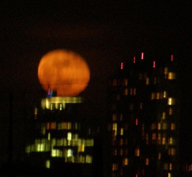 | Bericht: | Eigentlich hatte ich gehofft, endlich auch einmal mit Deep-Sky-Aufnahmen aufwarten zu können, aber 10 Tage Jagdhütte verliefen zwar romantisch und kuschelig warm hinter dem knisternden Ofen, aber draussen tobte der Schneesturm bzw. hüllten uns Nebelschwaden ein wie Erlenkönig. Dabei müsste "der" Klassiker für Anfänger jetzt genau vor der Hütte prangen, aber Orionnebel samt Kumpane versteckten sich hinter den Wolken und ließen den neuen Refraktor samt Fotoausrüstung friedlich weiter schlummern. Wieder in Wien, machte ich gestern Abend einen Hüpfer auf die Terrasse. Genau richtig um zu beobachten, wie sich der Mond mächtig über den Horizont schob und hinter den Wolkenkratzern der Uno-City emporkletterte. Er sah aus wie ein riesiger Ballon, der sich erhob, um neugierig in die Fenster der Hochhäuser zu schauen. Der Anblick war wirklich sensationell! Ich raste hinunter in die Wohnung, riss den Fotoapparat an mich und stürmte wieder auf die Terrasse. Keine Zeit um lange mit Blende und Belichtung herumzuspielen, vor allem schaffte ich es nicht den blöden AF auszuschalten (keine Brille!). Ich zielte nur hecktisch richtung Mond und drückte den Auslöser - Klick, klick! So hatte ich unseren Freund wenigstens noch rechtzeitig im Kasten. Die Bildqualität ist daher nicht berauschend, und die zweite Aufnahme ähnelt dem Schiefen Turm von Pisa. Aber ich hoffe trotzdem, dass die beiden Bilder ein wenig von der Faszination vermitteln, die bei diesem Anblick hervorgerufen wurde.