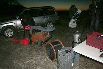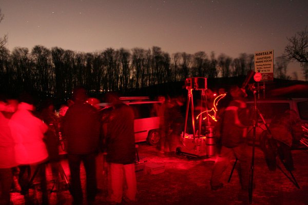 Heute klappt es mit dem Ersatztermin für die vor einer Woche vom Sturm vereitelte Einsteiger-Teleskopparty. Gut, heute gibt es auch einen recht stürmischen Wind aus Südost bis Südwest, doch der Himmel ist wolkenlos. Aus unseren Autos bauen wir wieder eine Wagenburg und dann kann es losgehen.
