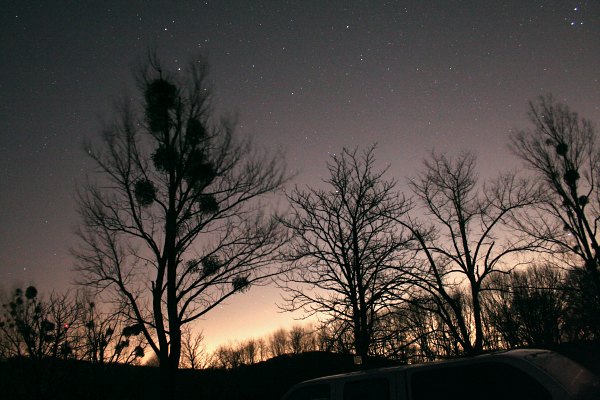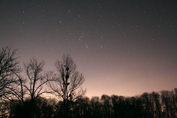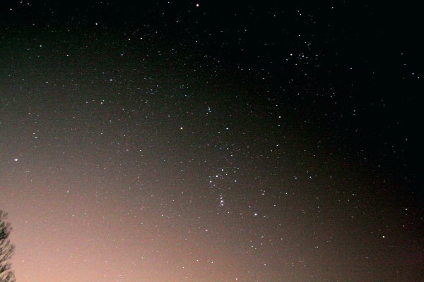 Gegen 20.30 Uhr hat sich, bedingt durch den Wind, die Party aufgelöst. Auch ich denke an Aufbruch, blicke aber noch einmal zum Himmel. Aus dem einen Blick wird eine gute halbe Stunde, die ich damit verbringe, zum ersten Mal seit langem mit viel Muße den Himmel mit freiem Auge zu durchmustern. Unglaublich, was man alles ohne Fernrohr sieht. M35, die Fuhrmann-Sternhaufen, M44 sowieso, Orionnebel und Pleiaden keine Frage, Milchstraßendetails. Herrlich. Und ich erkenne sogar noch den Kometen 17P/Holmes!