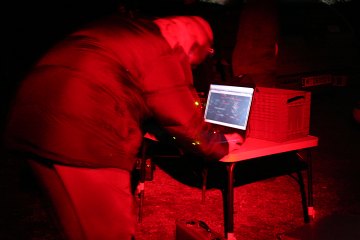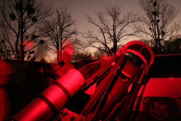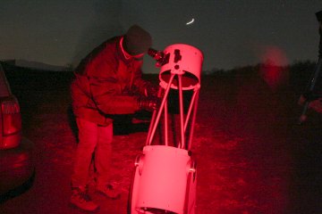 Gegen Ende der offiziellen Party probiere ich selbst mit dem 10" Lightbridge Dobson herum und muss fasziniert feststellen, wie viel Himmel man für so wenig Geld bekommt. Das Instrument ist enorm lichtstark. Der Anblick der Pleiaden auf einmal im Gesichtsfeld ist, trotz deutlich fehlender Komakorrektur, ein Genuß. Die offenen Sternhaufen im Fuhrmann und M35 in den Zwillingen sind ein Traum. Und dann der Orionnebel! Schon ohne Filter ist er ein toller Anblick, doch mit einem UHC-Filter (Astronomik UHC) fehlen die Worte. Interessant auch der Unterschied mit einem H-Beta-Filter: Die feinen Filamente treten in den Hintergrund, dafür ist der gesamte Bereich des Nebels gleichmäßig, sanft, diffus. Interessant.