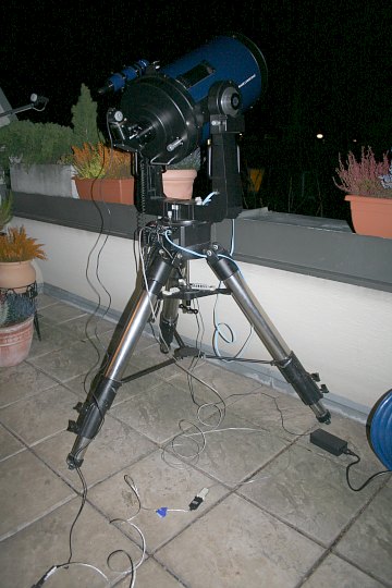 | Bericht: | Es ist ein sehr klarer Abend, aber das Funkeln der Sterne deutet auf schlechtes Seeing hin. Ega, ich muss sowieso ein wenig herumbasteln. Für eine Veranstaltung besteht die Notwendigkeit, mit einer - möglichst langen - Kabelverbindung das Teleskop fernzusteuern und dabei auch ein Bild mit der Webcam zu übertragen.