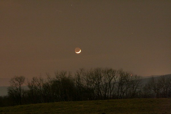 Es ist ein durchaus schöner Tag, auch wenn dann und wann Wolkenfelder durchziehen. Die Wettermodelle verheissen aber eine sternklare Nacht, und so fahren Roland und ich auf die Sofienalpe. Der malerische Untergang der dünnen, zunehmenden Mondsichel empfängt uns.