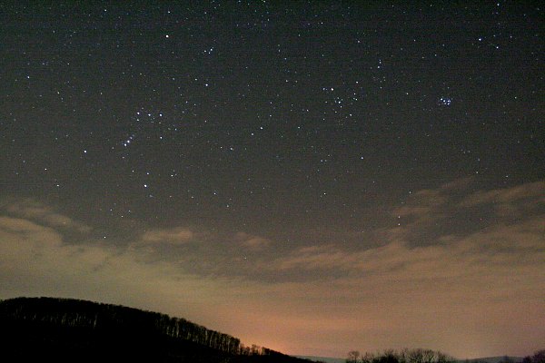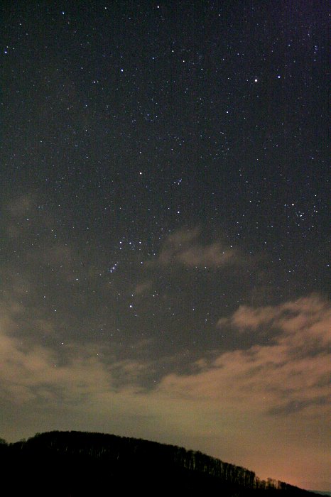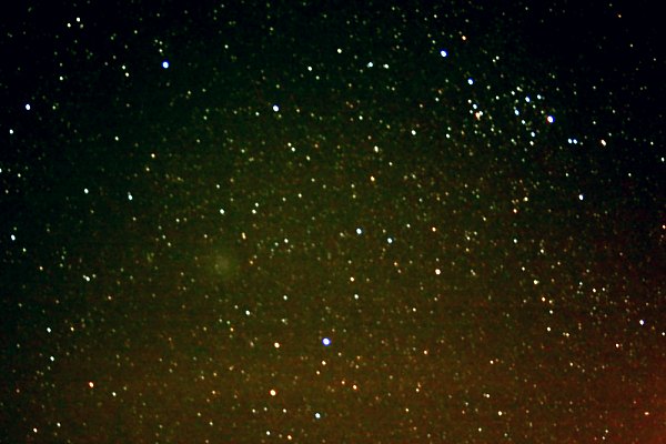 Saturn ist das erste Ziel. Mit dem 18" f/4.5 Obsession Dobson können wir bald mit einem 6,7mm Meade UWA Okular die Schönheit des Ringplaneten genießen, denn das Seeing ist blickweise recht gut. Beeindruckend ist aber auch die Ansammlung der Saturnmonde. Mit Starry Night sind sie bald identifiziert und wir machen uns bei sehr guter Durchsicht daran, möglichst viele Saturnmonde zu sehen. Titan, kein Problem. Rhea, Tethys, Dione, Enceladus, alle kein Problem. Iapetus, auch kein Problem, steht heute recht nahe beim Saturn. Mimas wird schon etwas schwieriger. Aber mit dem Dobson "an der Hand" kann man so beobachten, dass man Saturn immer etwas aus dem Blick rückt. Und da ist er schon, der schwache Mond, in Elongation, nahe bei Enceladus. Jetzt noch an Hyperion. Mit 14,1 mag nicht mehr ganz so einfach, aber mit der gleichen Technik - er steht nahe bei Titan, also weiter weg von Saturn - ist der schwache Mond mit indirektem Sehen gut zu erkennen. Super, acht Saturnmonde visuell! "Uuuhrf!" - so in etwa lässt sich das Geräusch beschreiben, das uns vom Saturn ablenkt. Wir aktivieren unsere Stirnlampen und sehen zwischen unseren Autos zwei leuchtende Augen in beunruhigend größer Höhe, die sich aber angesichts des Lichts aus dem Staub machen. Huch! Wir schwenken zu Mars. Auch hier ist die ganz starke Vergrößerung (307x) erstaunlich viele Details zu erkennen sind - wenn nicht wieder die langweilige Seite des Planeten vorne wäre. Ein leichter blauvioletter Filter zeigt schön die Atmosphäre des Planeten, ein Orangefilter tatsächlich auch einige Oberflächendetails. Nächstes Ziel ist Sirius. Mit dem gleichen Okular, der Blick auf den blendend hellen Stern läßt das Auge tränen. Wieder der gleiche Trick. Ja! Ich sage nichts und überlasse Roland das Okular. Ja! Wir vergleichen unsere Eindrücke und stellen übereinstimmend fest, dass wir Sirius B ohne grosse Probleme erkannt haben. Okularwechsel. 30mm Pentax XW und auf zu Deep Sky. M42 ist ein Traum, mit dem Astronomik UHC-Filter noch mehr. Einfach nicht zum Sattsehen. Unglaublich viele Details, reich strukturiert. Ohne einen solchen Filter ist der Reflexionsnebel M78 zu beobachten, aber nicht beeindruckend. Ich schalte auf den Astronomik H-Beta-Filter und stelle den Pferdekopfnebel ein. Er ist gerade noch zu erkennen, aber nicht berauschend. Orion steht schon zu tief! Ein schönes Objekt muss her. M35 in den Zwillingen ist es, toll auch der kleine dichte Haufen NGC 2158 in seiner Nähe. Irgendetwas schaubt seltsam hinter den Büschen. Angst. Wieder die Stirnlampen aufgedreht, da sind wieder die beiden grossen, leuchtenden Augen. Sie gehören zu einem Hund beachtlicher Größe, der scheinbar unbeaufsichtigt und ohne Beißkorb hier unterwegs ist. Unser Licht verscheucht ihn wieder. Hmmm. Ich montiere den Astronomik O-III-Filter und stelle den Crabnebel M1 ein. Beeindruckend. Ein schönes, kontrastreiches Bild. Noch ein Objekt für diesen Filter gefällig? M97, der Eulennebel, wird mit vereinten Kräften eingestellt und ist ebenfalls sehr deutlich. Dobsonpause. Mit freiem Auge und Feldstecher Durchmusterung des Himmels. M41, M44, Pleiaden, M34, h+Chi Persei sind lauter tolle Feldstecherobjekte. Das ist doch noch etwas im Perseus! Mit viel Mühe ist Komet 17P/Holmes im Feldstecher zu erkennen. Ich nehme ihn mit stehender Kamera auf, 12x20 Sekunden bei 55mm, etwas zu lang, daher kurze Strichspuren.