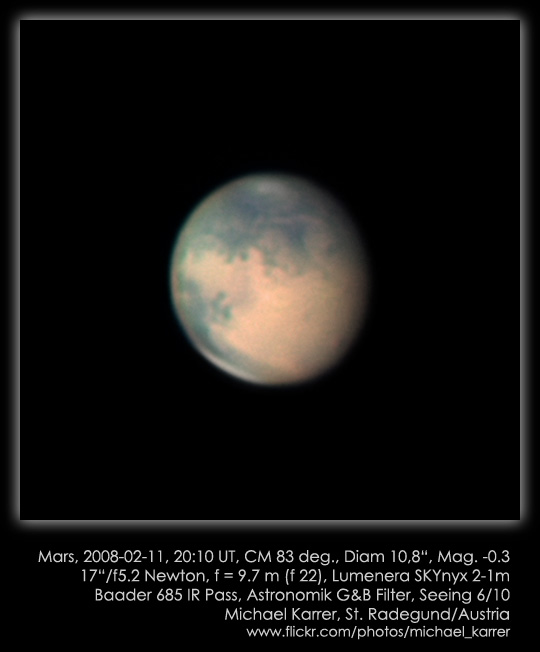 | Bericht: | Mars dürfte derzeit eine sehr klare Atmosphäre haben, denn Oberflächenstrukturen sind trotz des kleinen Durchmessers gut zu erkennen. Sogar Olympus Mons ist als rötlicher Fleck auszumachen!