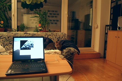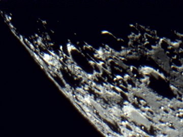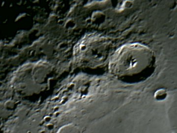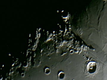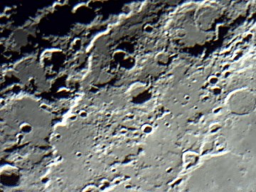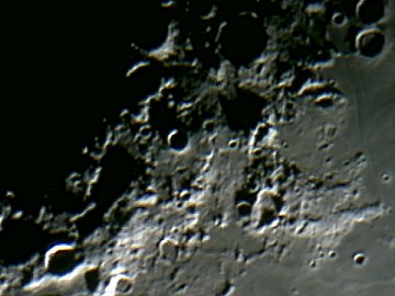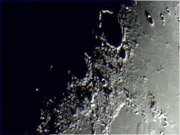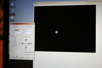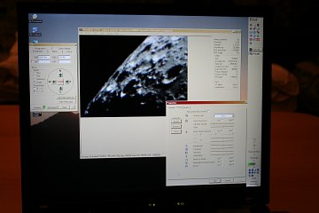 Die Suchercam zeigt an sich ohne Probleme Mond und helle Objekte wie Mars; das Fadenkreuz mache ich sichtbar, indem ich mit einem roten Lämpchen vorne in das Objektiv leuchte. Dennoch ist das Einstellen von Objekten nicht einfach, da die Sucherbrennweite etwas zu kurz ist. Irgendwo habe ich noch ein Rohr mit 600mm Brennweite, das wird der nächste Test. Alles klappt. Zwei Webcams - mit VirtualDub kann ich problemlos hin- und herschalten - und die Teleskopsteuerung über die auf derzeit schon 15m verlängerte Strecke. Ich spiele mit dem Mond herum und so ganz nebenbei mache ich die folgenden Webcamaufnahmen. Aus dem Wohnzimmer wie gesagt.