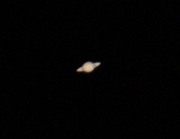 Inzwischen ist es nach 2 Uhr und endlich schielt Saturn hinter dem Wald hervor. Der steht doch heute Nacht in Opposition, also schnell beobachtet. Wow, wirklich nett anzusehen, so schön hell, aber sehr klein! Das packt die Kamera sicher nicht, wird wahrscheinlich nur ein i-Punkterl, oder ein deformiertes Eiernockerl, wie am Dobson. Aber einen Versuch ist es wert, und siehe da, so schlecht ist die Aufnahme gar nicht.