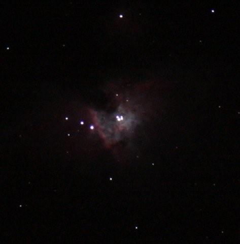 Am nächsten Abend, frisch erholt, wagen sich Gaby und ich mit der Canon 40D an den Refraktor. Von meinen M42-Aufnahmen animiert, peilt Gaby sofort den Orionnebel an. Das gleiche Problem: wie stellt man ein Objekt scharf, ohne es zu sehen? Wir basteln, wir probieren ... wir verzweifeln! Aber dann plötzlich, nach gut einer Stunde, überlauern wir die schlaue Kamera. Sie hat ein Lupenkasterl, mit dem man einen Stern anfahren und stark vergrößern kann. Also schnell zu Sirius geschwenkt, scharf gestellt, und wieder zurück zu M42. Ahhhhhhh, endlich das erste Foto, und die Trapezsterne sind sogar viel schärfer als bei der kleinen Olympus. Super, wir gratulieren uns gegenseitig.