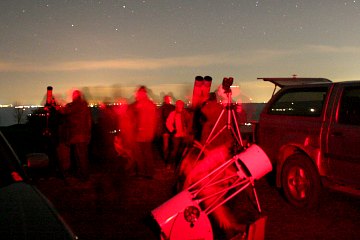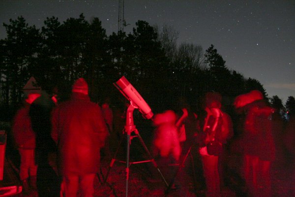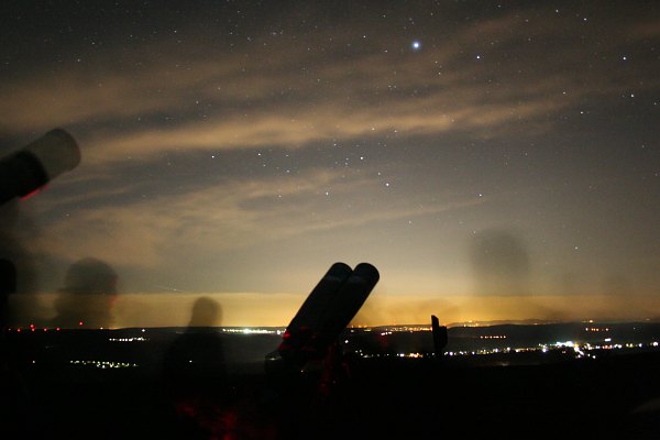 Natürlich ist der riesige "Feldstecher" der Star des Abends. Die Ankündigung, dass durch dieses Gerät beobachtet werden kann, hat trotz der spätwinterlichen Temperatur über 30 Beobachter angelockt, so viele wie noch nie an diesem Platz, in dieser Runde. Ein schöner Erfolg, gekrönt von klarem Himmel.