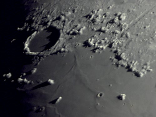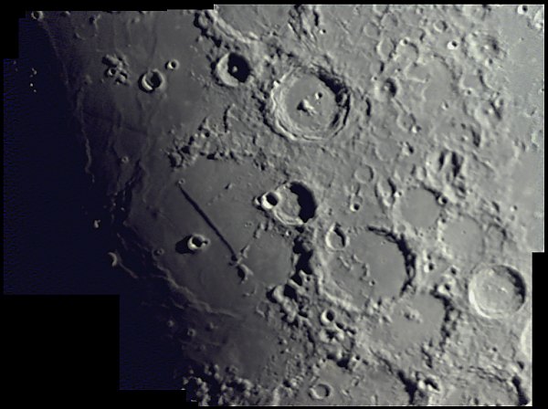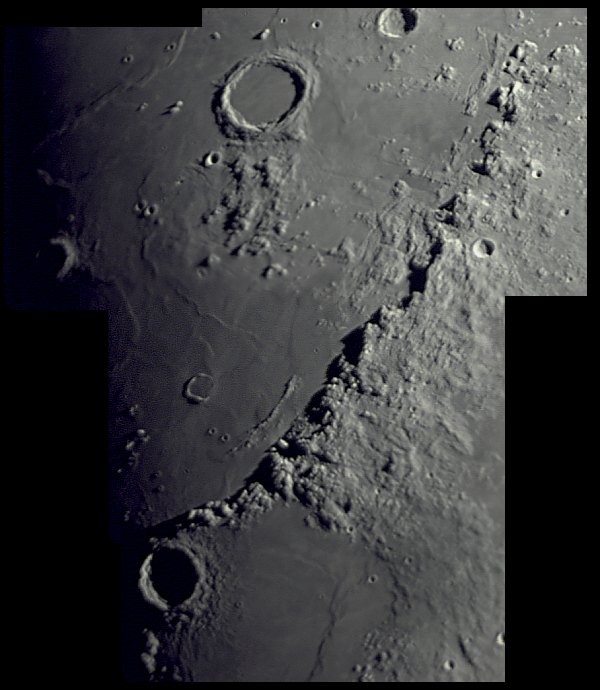 Auch diese Aufnahme ist ein Mosaik, aber mit einer anderen Technik erstellt. Das Bild der Apenninen entstand aus vier Webcamvideos, die individuell mit Registax gestackt und dann mit iMerge zusammen gesetzt wurden. Bei dieser Aufnahme überlasse ich Registax die Mosaikbildung. Während der Aufnahme bewege ich das Fernrohr, so dass der kleine, helle Krater Thebit A (rechts von der Langen Wand) am Bildrand entlang wandert. Ich wähle ihn als Refrerenzpunkt und wähle beim Stacken die Option "Expand to maximum imagesize". Registax erzeugt so ein Bild aus der Gesamtfläche, die der Kamerachip während der Aufnahme überstrichen hat. Natürlich sind die Randbereiche des Bildes nicht so scharf wie die Mitte. Mit dieser Technik lassen sich Mosaike erstellen, die etwa 70% größer sind als das Bildfeld der Kamera. Links von der Langen Wand liegt der kleine Krater Birt und von ihm nach Norden (links oben) läuft die dünne Rille Rima Birt. Weiter nach Süden.