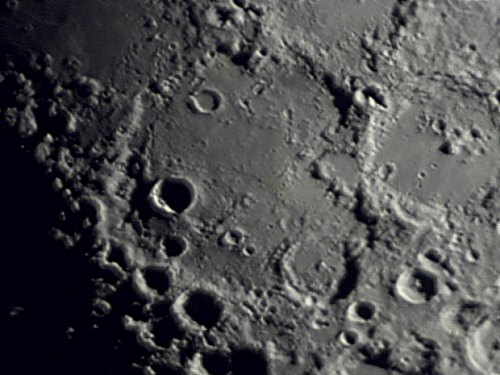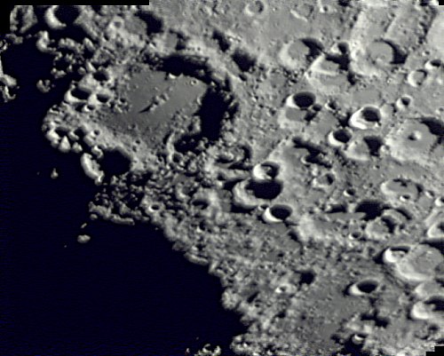 Wieder ein Einzelbild. Der große Mondkrater Clavius liegt noch ganz im Dunkeln und sein Kraterrand bildet eine markante Trennlinie südlich des großen, von vielen kleinen Kratern "gestörten" Kraters Magnius. Wir befinden uns hier im kratergesättigten südlichen Bergland des Mondes. Wieder etwas nach Norden.