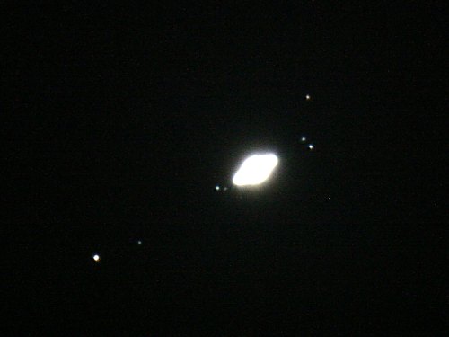 Beachtenswert: Durch die nahe Kantenstellung der Ringe stehen die Monde schon häufiger in einer Linie! Dann geht der Mond auf. Ein interessanter Anblick insofern, als durch die Libration das Mare Crisium randfern steht und der Terminator über eine selten zu sehende Region der Mondoberfläche läuft.