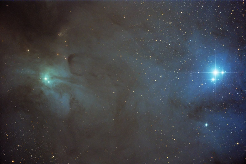 | Bericht: | Um Rho Ophiuchi - dem hellsten Stern rechts - breitet sich ein Gebiet zarter Staubnebel, duchsetzt mit blauen Reflexionsnebeln, aus.